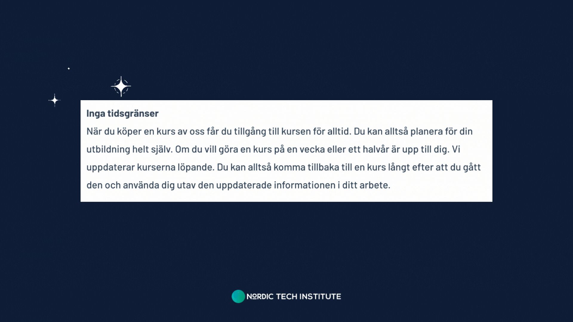 Jo, vi på Nordic Tech Institute ser alltid till att våra kurser är uppdaterade med de senaste. Och eftersom du har tillgång till kursen, för alltid, efteråt att du har gått klart kursen så innebär det alltså att du har kvar ditt inlogg till kursportalen och kan uppdatera dig om det nya som skett inom den digitala sfären. Bra va?!